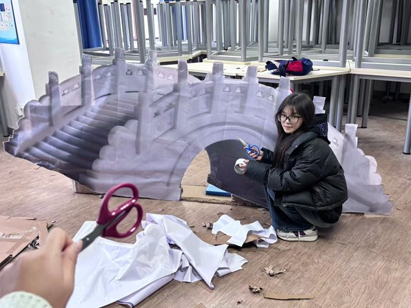 在舞美道具方面,学生团队展现了令人敬佩的“匠人精神”。为了还原广寒宫的神秘与意境,特别是那座栩栩如生的“玉百石桥”,道具组的同学为此付出了巨大的努力——跑遍了几个快递站,收集了大量的纸壳材料,最终拼接、绘制、打磨,DIY出了一座立体、精美的石桥。这不仅是道具,更是创新和对艺术的追求。