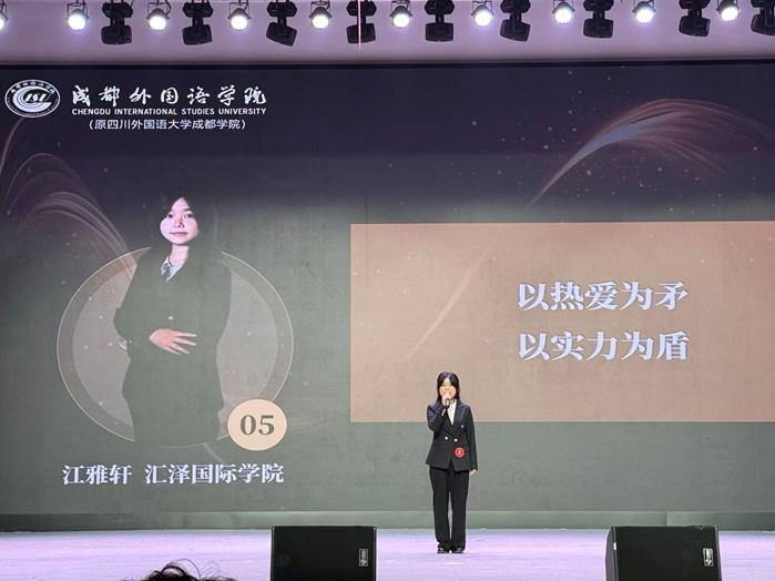 本次大赛旨在丰富校园文化生活,发掘和培养优秀主持人才。比赛环节设置全面,涵盖自备主持、即兴评述、才艺展示等多个方面,对选手的语言表达、知识储备和现场掌控能力提出了极高要求。比赛中,江雅轩同学以饱满的热情、清晰的逻辑和富有感染力的双语(中文、英语)表达,赢得了评委老师与现场观众的一致好评,充分展现了我院学子自信昂扬、积极向上的精神风貌。